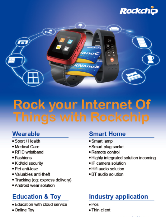 瑞芯微的IOT產品如智能手表及家居系列采用ARM Cortex M系列內核,不同于以往以A9、A15、A17等為代表的應用處理器,M系列處理器其實是微控制器,適用于智能調溫器、智能手表、集成電路能耗管理單元等要求低功耗的產品上,有利于促進形成物聯網與可穿戴設備的市場。