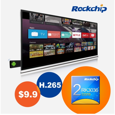 該方案采用RK3036芯片,支持H.265。產品通過直連電視設備,即可讓用戶獲得完整盒子體驗效果。9.9美金的方案將極大推進盒子全面普及進程。