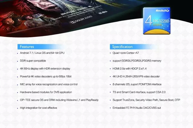 Rockchip在CCBN2017展出搭載四核超優(yōu)性?xún)r(jià)比的機(jī)頂盒芯片產(chǎn)品RK3228B以及高性能的機(jī)頂盒芯片產(chǎn)品3228H。方案亮點(diǎn)涵蓋: