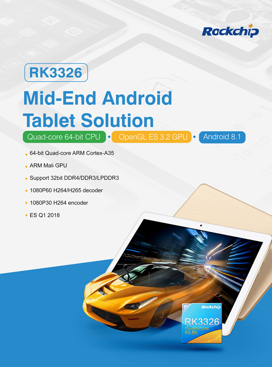 RK3326采用ARM 64bit 四核Cortex-A35 CPU,綜合性能較ARM A7提升近40%;支持OpenGL ES 3.2, Vulkan 1.0 GPU;支持DDR4/DDR3/LPDDR3等多種型號DDR,可靈活選擇配置;充裕的帶寬設計,更好地支持較高分辨率LCD及更為復雜的應用場景;支持MIPI CSI,內置8M ISP;支持Android 8.1系統。2018年Q1向合作伙伴提供平臺。