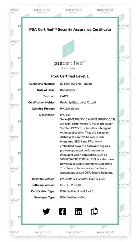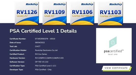 瑞芯微RV11xx系列芯片通過Arm PSA Certified安全認(rèn)證