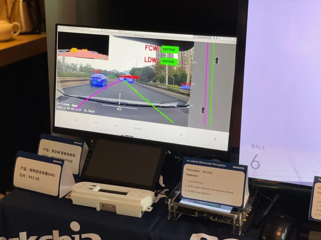 汽車電子展區,展出各類搭載瑞芯微方案的車載產品,涵蓋乘用車方案、商用車方案及智能座艙方案,現場演示了搭載RK3588芯ADAS汽車視覺算法,可識別汽車在駐車行進中的車距路距及物體識別,以實現避障及360度環視功能,還展示了搭載RK3358M的中控屏等應用。