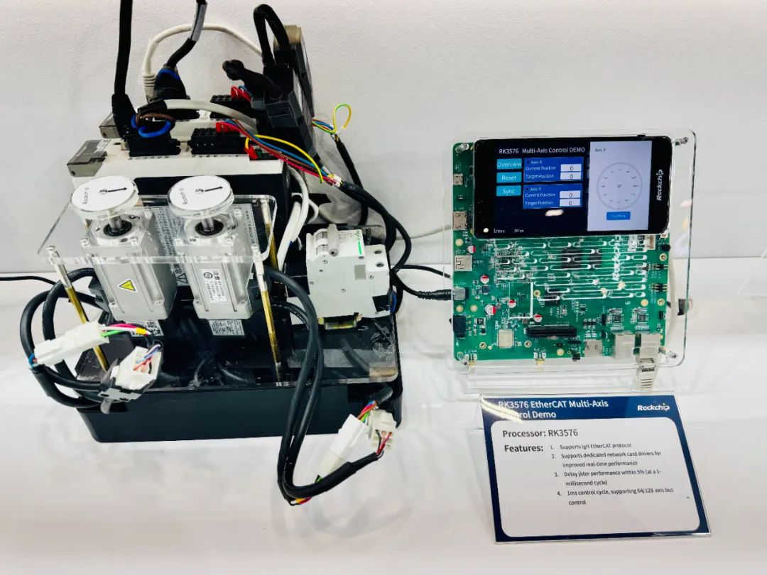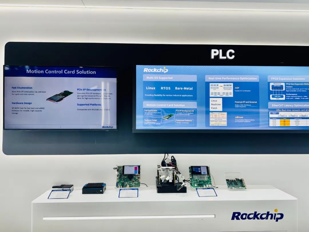 PLC方向,搭載RK3588J、RK3576J、RK3568J、RK3506J的EthercaCAT多軸控制、PCIe EP卡及PLC方案及應用展出。基于RK3576J的多軸控制支持IgH EtherCAT協議,兼容主流工業設備如伺服驅動器、I/O模塊,可適配專用網卡驅動,實時性更強;延時抖動性能達到5%以內(周期為1毫秒),在1ms控制周期,可支持64/128軸總線控制,針對不同類型的運動控制場景的適用性更強,適用于工業機器人、物流等應用場景的設備升級。
