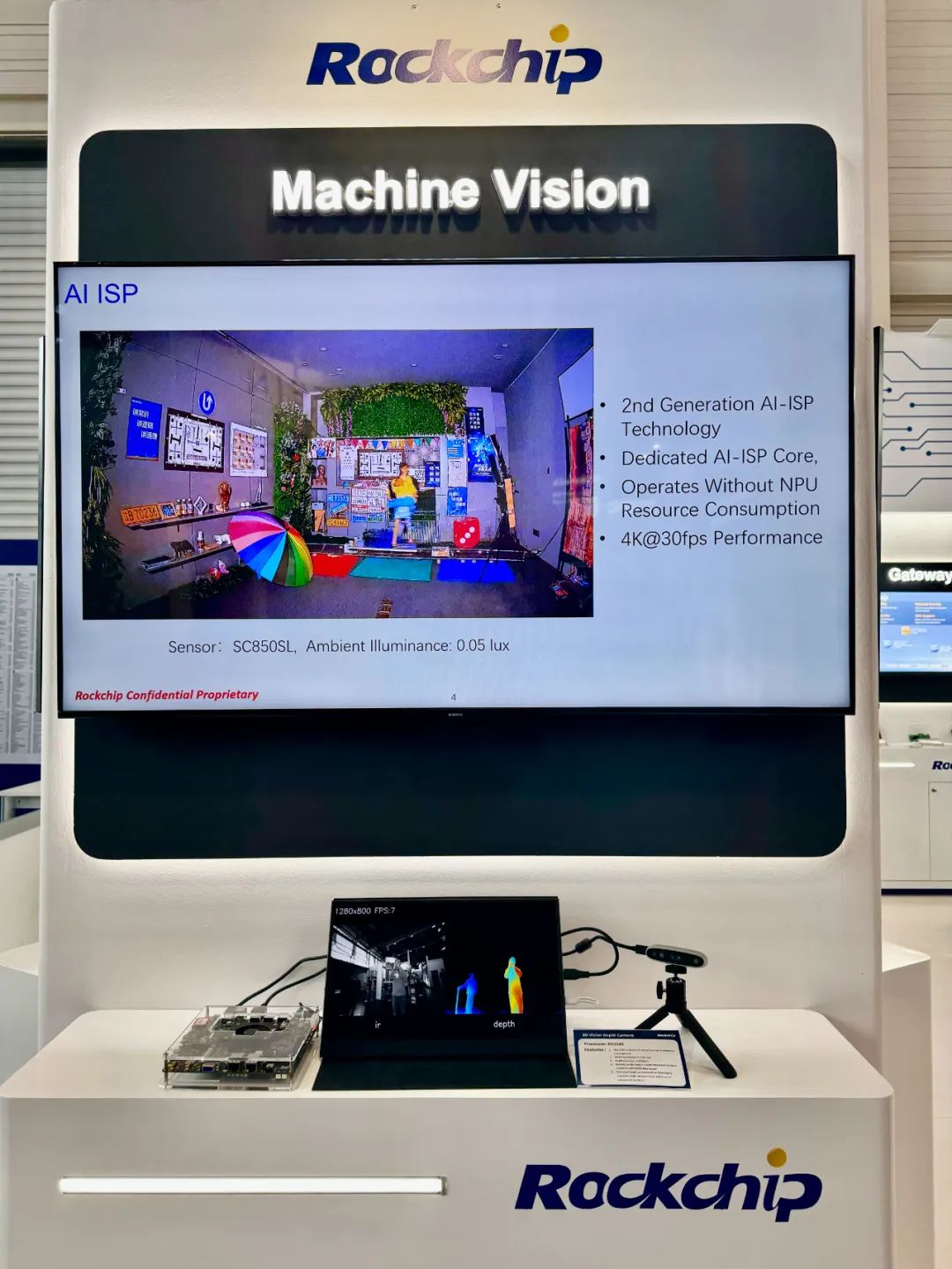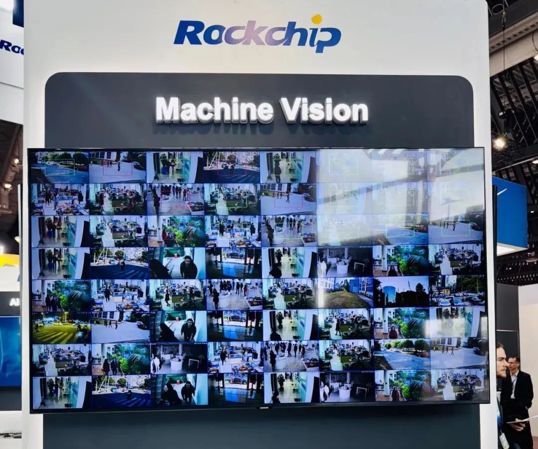 二、完善端側AI技術矩陣 擴展新型工業應用場景此次,瑞芯微展出了基于自研芯片平臺的系列AI技術,涵蓋機器視覺、大語言模型(LLM)、多模態交互等方向,為工業自動化、智能制造及設備智能化提供全棧解決方案。RK3588多路邊緣計算方案用于智能視頻分析檢測,可支持最高6路人臉檢測、24路周界及32路智能動檢測,提供RockIVA算法套件,支持turnkey人臉識別、周界檢測、智能動檢(人車非)模型。