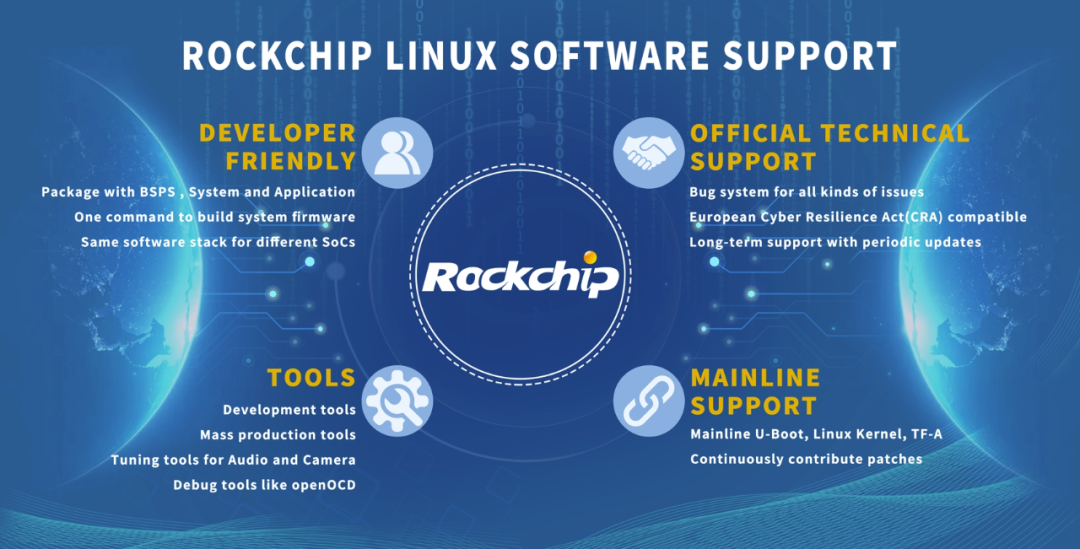 三、全面軟件保障,豐富生態資源匹配針對工業場景智能化,瑞芯微提供全面軟件保障支持,主流芯片平臺持續更新適配最新Linux及Android系統版本,為全球開發者提供 BSP、系統與應用一體化軟件包,各領域合作伙伴及開發者均可在瑞芯微官方平臺獲得全類型問題的技術支持以及各類開發調試工具。在安全支持方面,瑞芯微提供全鏈路的安全啟動SecureBoot、Trustzone、加解密引擎等全面的安全保障機制,防止固件完整性被篡改。