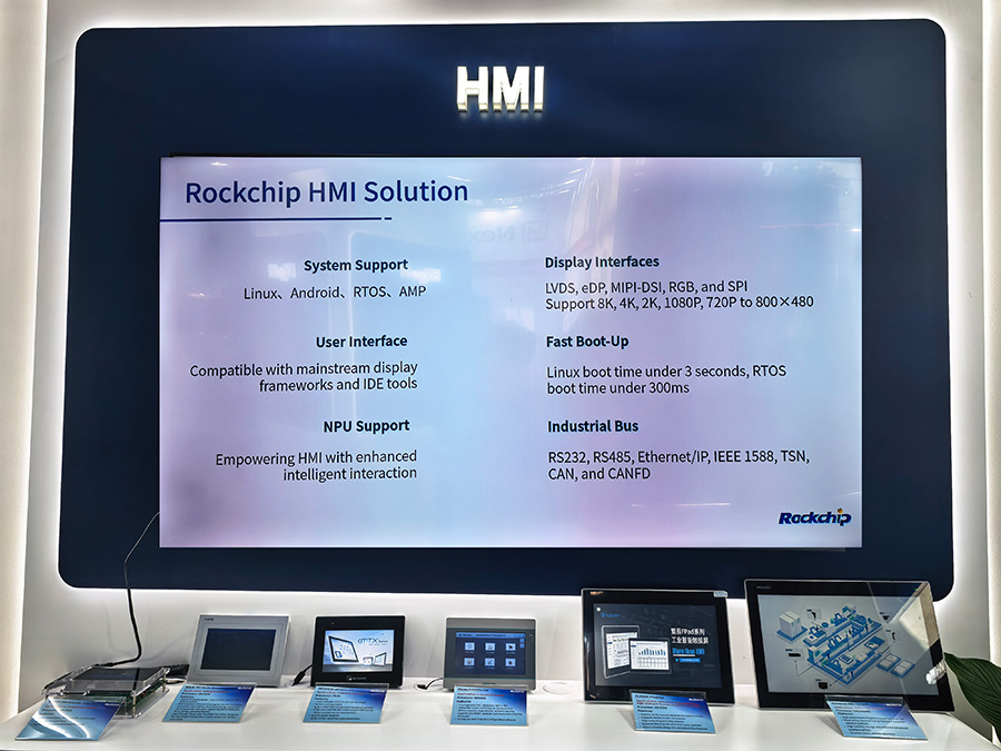 工業HMI:現場聯動的六款不同品牌HMI終端及Web人機界面,搭載了從輕量RK3506J、PX30K到高性能RK3568J、RK3588J系列方案。輕量化RK3506J HMI方案在工業HMI及控制領域已成熟商用,支持快速啟動顯示UI(Linux系統2.5秒內,RTOS系統0.6秒內),滿足工業設備快速響應的需求如醫療設備、自動化產線等。