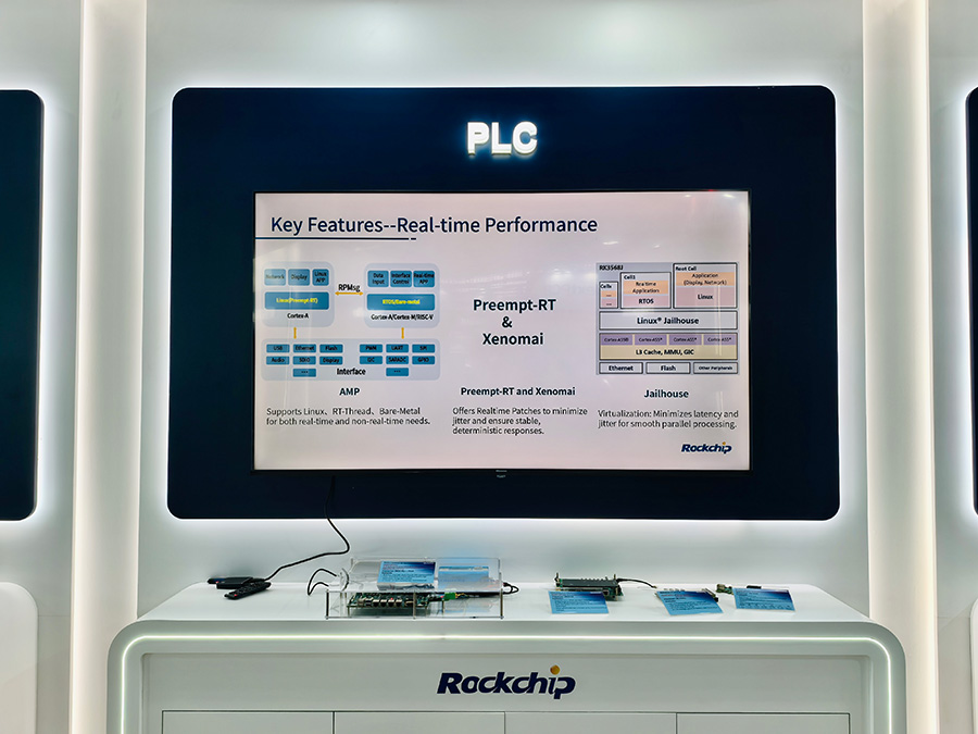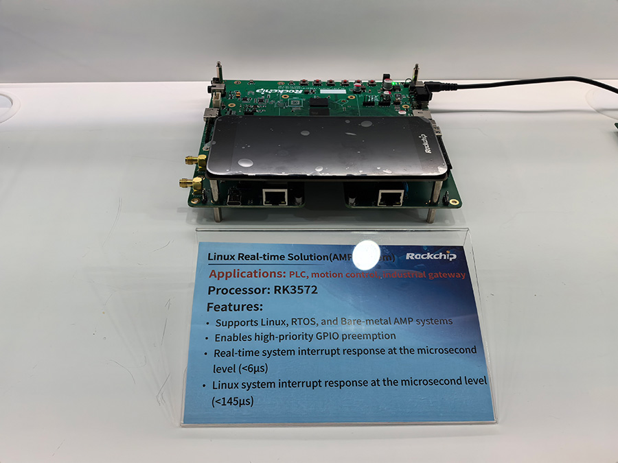 PLC與運動控制:在工業控制核心的PLC領域,基于RK3506的PLC、RK3568J的運動控制卡,以及首次亮相的RK3572 Linux實時系統方案(支持多核異構系統部署),向業界展示了瑞芯微在實時性上的極致打磨。RK3576J搭配FPGA的多路AD采集處理方案,為高精度工業現場控制提供了國產優選路徑。