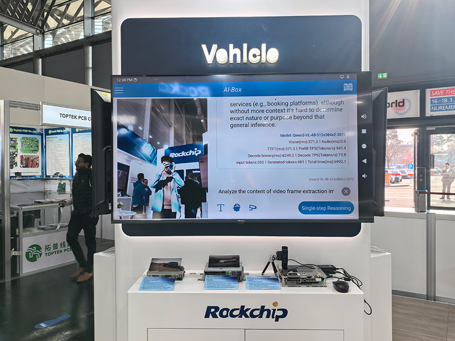 汽車展區重點展出了最新的AI BOX方案,基于RK3588+RK1828架構,致力于為用戶打造低延遲、快響應的全離線智能交互體驗。該方案在保護用戶數據隱私的前提下,支持文本、圖文、視頻、語音等多種模態的推理任務,通過算力擴展,可實現艙內外視覺場景智能識別,如前車識別、交通標志實時解讀、眼動追蹤、兒童危險感知、空間手勢感知、停車哨兵等功能。