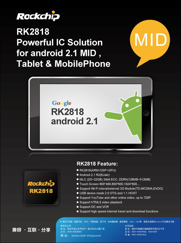Fuzhou Rockchip Electronics CO., Ltd is a national recognized IC(Inteqrated Circuit) design company. Rockchip,which is focus on the chipdisign of the Consumer electronicin the mobile internet, is a professional supplication of individual mobile intelligence terminal. The self-R&D RK series won the “China chip - the best performance award”for the third consecutive year, continued to hold the highest honour in the Chinese IC design field and “Optimum DesignCompany” in 2009, which make our company the first brand ofthe chip design in the multi-media field.Rockchip's cooperators are around the world and has become the top brand of Mobile Internet chip solution.Rockchip's headquarter is in Fuzhouwhose main work is designing and developing;it's branches are inBeijing and Shenzhen,mainly work on branches progroms andmarketing.