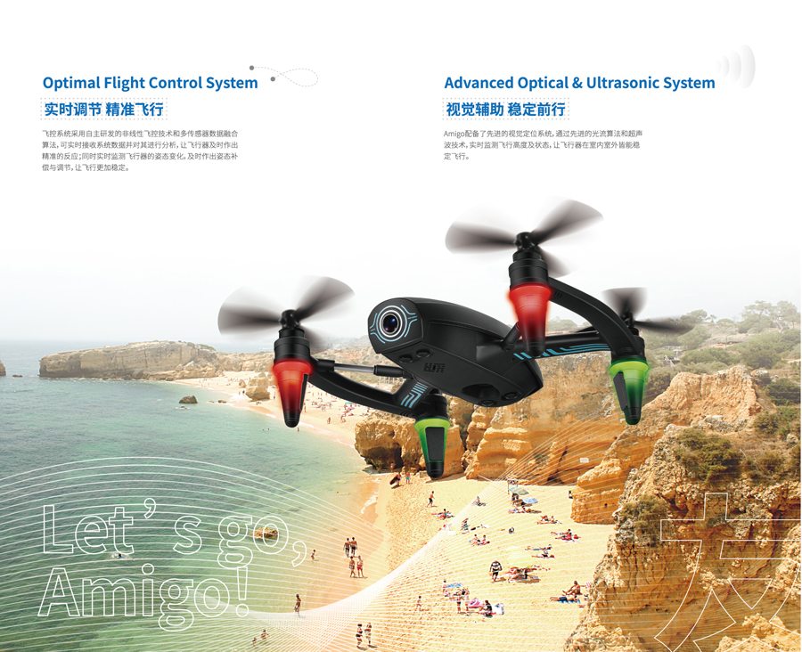 Based on the application of RK3288, the camera of AMIGO was integrated with the body, which significantly narrowed the volume and weight. The wheelbase was only 300mm. With stabilize image stabilization technology and high-speed image processing ability, AMIGO could ensure and improved the clarity and stability of images and the stability of the real-time video back.