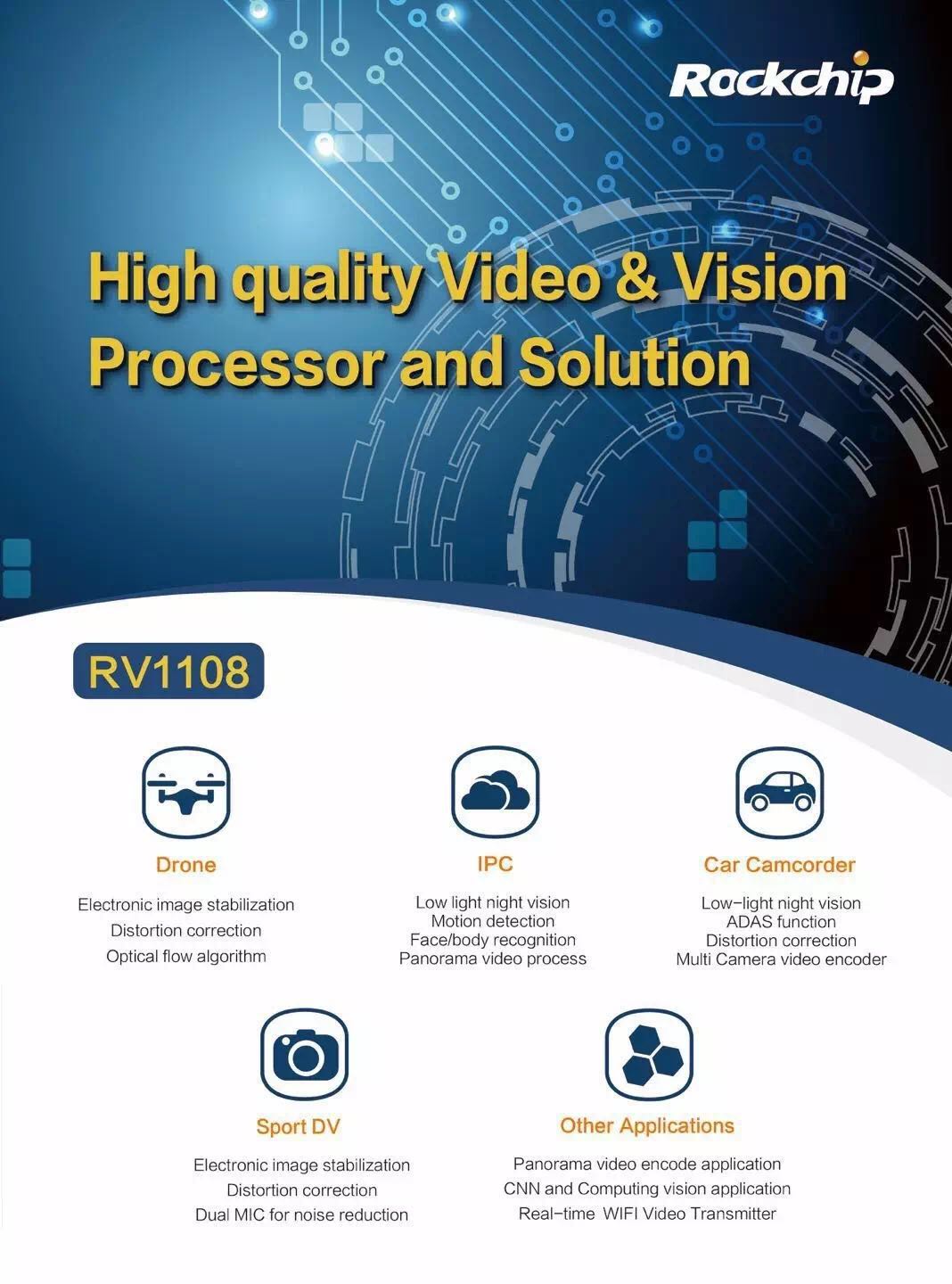 Rockchip RV1108 is powerfully open and programmable, and diversified thoughts and directions for products are available for its cooperative partners, and it can be applied widely in automobile, security monitoring, home assistive robot, action camera and UAV.